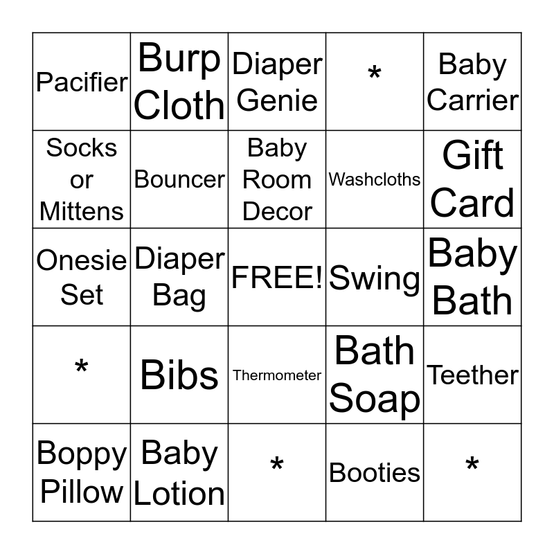 This bingo card has a free space and 24 words: Bibs, Baby Lotion, Baby Room Decor, Boppy Pillow, Baby Carrier, Pacifier, Socks or Mittens, Burp Cloth, Swing, Thermometer, Washcloths, Onesie Set, Bath Soap, Teether, Bouncer, Booties, Baby Bath, Diaper Genie, Gift Card, Diaper Bag, *, *, * and *.