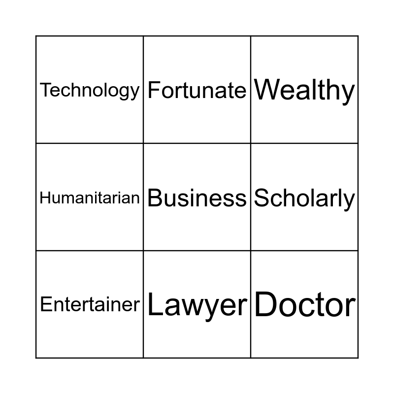 This bingo card has 9 words: Entertainer, Wealthy, Fortunate, Humanitarian, Technology, Scholarly, Business, Doctor and Lawyer.