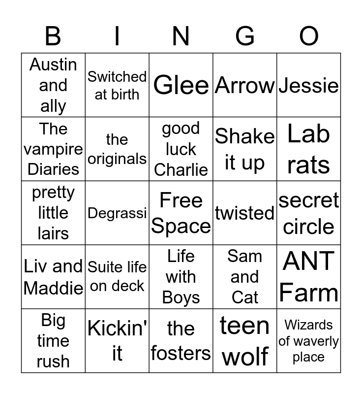 This bingo card has a free space and 24 words: Suite life on deck, Kickin' it, good luck Charlie, Big time rush, Jessie, Austin and ally, The vampire Diaries, Switched at birth, twisted, Life with Boys, Shake it up, pretty little lairs, Sam and Cat, ANT Farm, the originals, teen wolf, secret circle, Glee, Lab rats, Degrassi, Wizards of waverly place, Liv and Maddie, Arrow and the fosters.