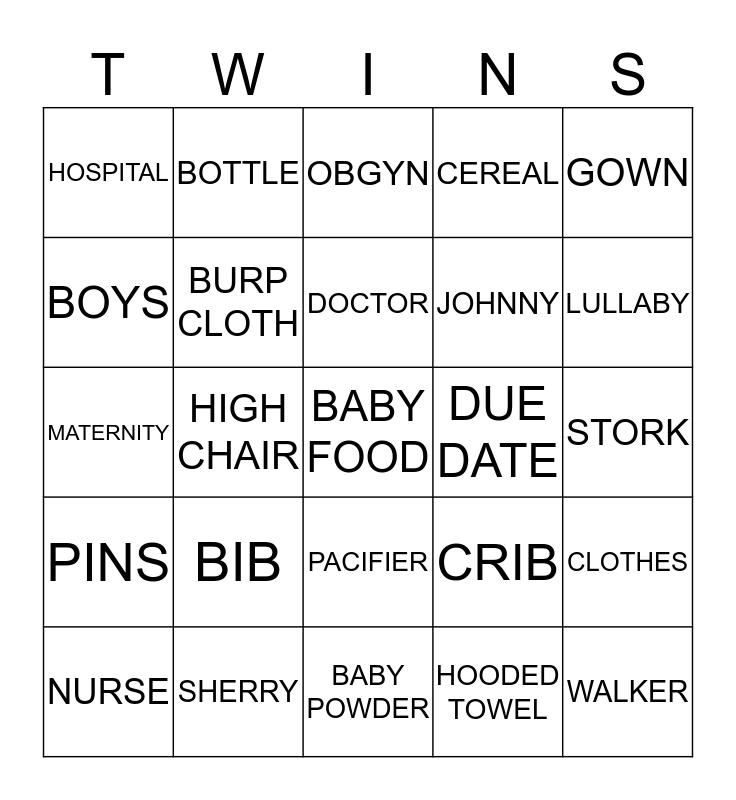This bingo card has 49 words: FREE!, BABY FOOD, BABY LOTION, BABY POWDER, BIB, BOOTIES, BOTTLE, BOUNCY SEAT, BOYS, BREAST PUMP, BURP CLOTH, CEREAL, CLOTHES, CRIB, DIAPER, DIAPER BAG, DOCTOR, DUE DATE, FORMULA, GOWN, HIGH CHAIR, HOODED TOWEL, HOSPITAL, JOHNNY, LABOR, LULLABY, NURSE, ONESIE, PACIFIER, PINS, PLAY PEN, RATTLE, RUBBER DUCKY, SAFETY PIN, SHERRY, SLEEPER, SOCKS, SPOON, STORK, SWING, TEETHER, TWINS, WALKER, WIPES, MATERNITY, OBGYN, STROLLER, BABIES and CAR SEAT.