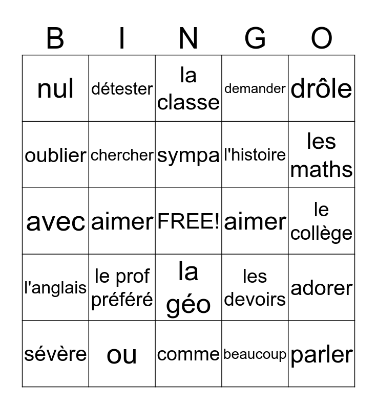 This bingo card has a free space and 24 words: le prof préféré, ou, sympa, sévère, drôle, nul, oublier, détester, aimer, la géo, l'histoire, avec, les devoirs, adorer, chercher, beaucoup, le collège, la classe, les maths, aimer, parler, l'anglais, demander and comme.