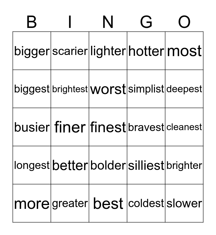 This bingo card has 25 words: better, best, worst, more, most, bigger, biggest, scarier, bravest, bolder, simplist, busier, silliest, brighter, brightest, slower, cleanest, lighter, deepest, finer, finest, greater, longest, hotter and coldest.