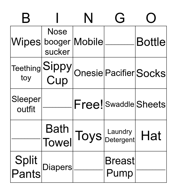 This bingo card has a free space and 24 words: Bath Towel, Diapers, Onesie, Split Pants, Bottle, Wipes, Teething toy, Nose booger sucker, Swaddle, Toys, Pacifier, Sleeper outfit, Laundry Detergent, Hat, Sippy Cup, Breast Pump, Sheets, Mobile, Socks, _________, _________, _________, _________ and _________.