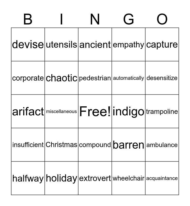 This bingo card has a free space and 24 words: Christmas, holiday, pedestrian, halfway, capture, devise, corporate, utensils, indigo, compound, automatically, arifact, barren, ambulance, chaotic, wheelchair, trampoline, ancient, desensitize, miscellaneous, acquaintance, insufficient, empathy and extrovert.