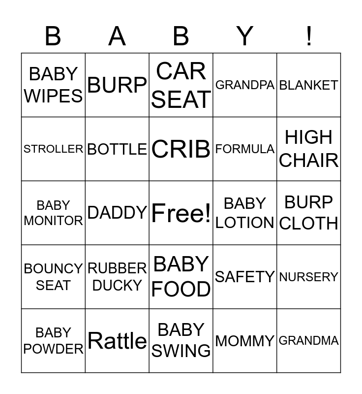 This bingo card has a free space and 24 words: RUBBER DUCKY, Rattle, CRIB, BABY POWDER, BLANKET, BABY WIPES, STROLLER, BURP, BABY LOTION, BABY FOOD, FORMULA, BABY MONITOR, SAFETY, NURSERY, BOTTLE, MOMMY, BURP CLOTH, CAR SEAT, HIGH CHAIR, DADDY, GRANDMA, BOUNCY SEAT, GRANDPA and BABY SWING.