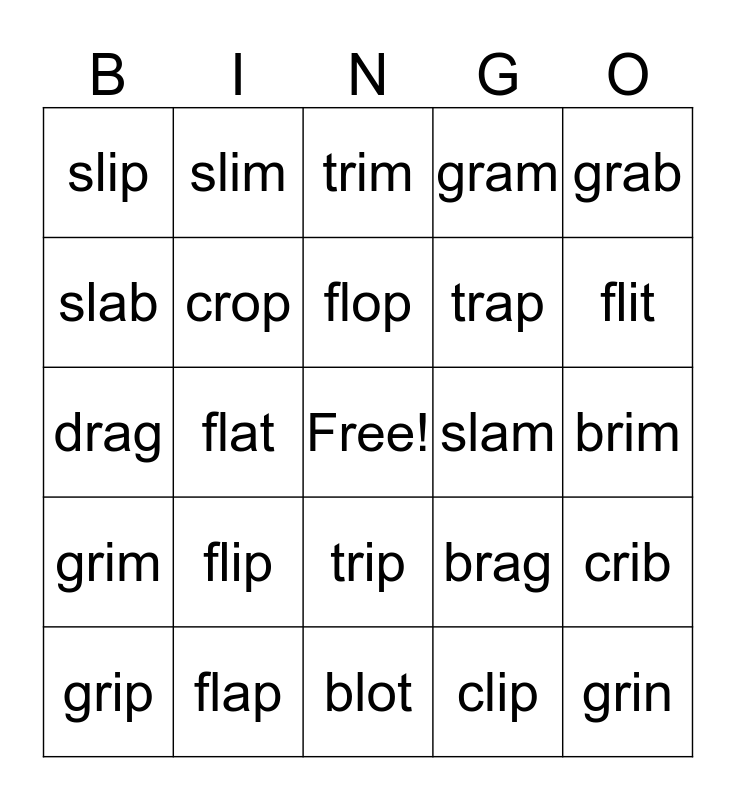 This bingo card has a free space and 24 words: flip, flap, flop, grip, grab, slip, slab, slim, slam, trip, trap, drag, brag, crib, crop, clip, brim, trim, flit, flat, grin, grim, gram and blot.