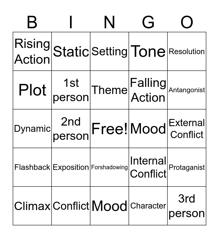 This bingo card has a free space and 24 words: Exposition, Conflict, Theme, Climax, Resolution, Rising Action, Plot, Static, Mood, Forshadowing, Falling Action, Dynamic, Internal Conflict, Protaganist, 1st person, Character, External Conflict, Setting, Antangonist, 2nd person, 3rd person, Flashback, Tone and Mood.