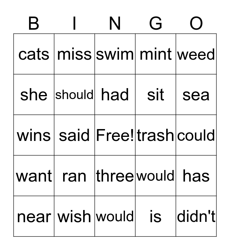 This bingo card has a free space and 24 words: ran, wish, had, near, weed, cats, she, miss, trash, three, sit, wins, would, has, should, is, could, swim, sea, said, didn't, want, mint and would.