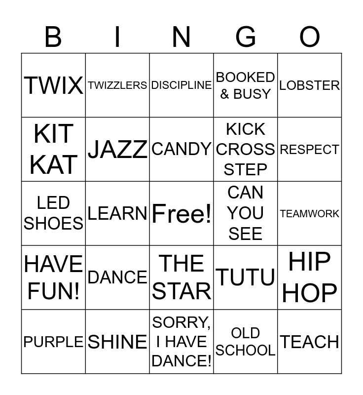 This bingo card has a free space and 24 words: DANCE, SHINE, CANDY, PURPLE, LOBSTER, TWIX, KIT KAT, TWIZZLERS, CAN YOU SEE, THE STAR, KICK CROSS STEP, LED SHOES, TUTU, HIP HOP, JAZZ, OLD SCHOOL, TEAMWORK, DISCIPLINE, RESPECT, LEARN, TEACH, HAVE FUN!, BOOKED & BUSY and SORRY, I HAVE DANCE!.