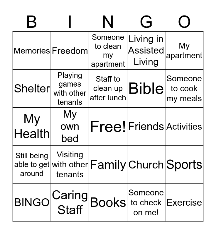 This bingo card has a free space and 24 words: Visiting with other tenants, Caring Staff, Staff to clean up after lunch, BINGO, My apartment, Memories, Shelter, Freedom, Friends, Family, Bible, My Health, Church, Sports, Playing games with other tenants, Someone to check on me!, Activities, Someone to clean my apartment, Someone to cook my meals, My own bed, Exercise, Still being able to get around, Living in Assisted Living and Books.