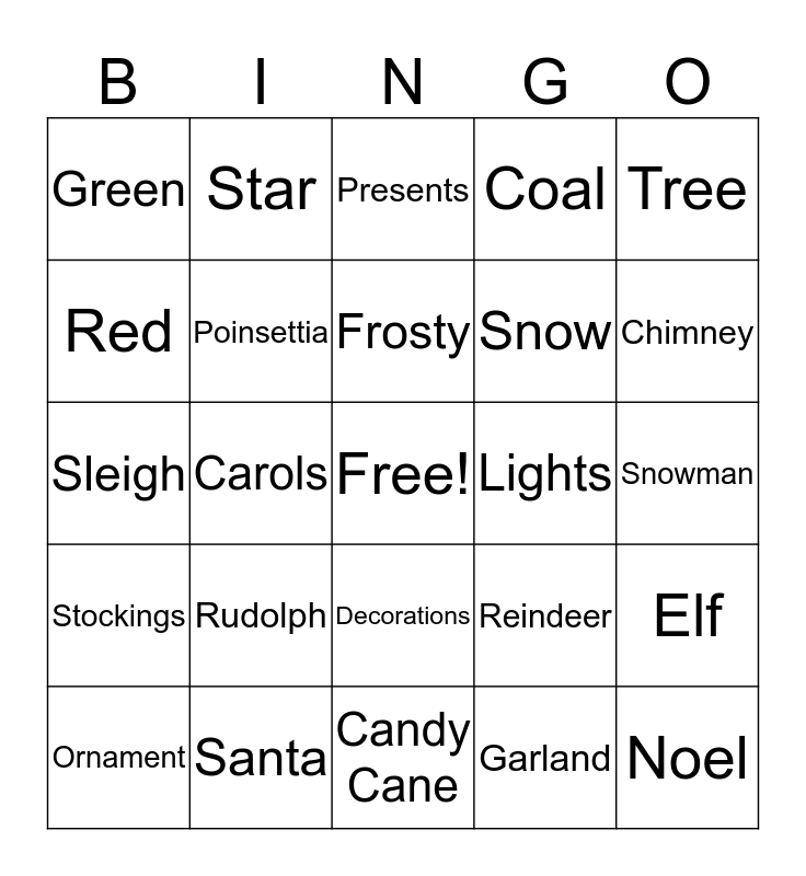 This bingo card has a free space and 24 words: Rudolph, Santa, Frosty, Ornament, Tree, Green, Red, Star, Lights, Decorations, Snow, Sleigh, Reindeer, Elf, Poinsettia, Garland, Snowman, Presents, Chimney, Carols, Noel, Stockings, Coal and Candy Cane.