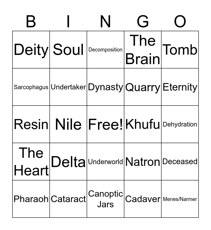 This bingo card has a free space and 24 words: Delta, Cataract, Dynasty, Pharaoh, Tomb, Deity, Sarcophagus, Soul, Khufu, Underworld, Quarry, Resin, Natron, Deceased, Undertaker, Cadaver, Dehydration, Decomposition, Eternity, Nile, Menes/Narmer, The Heart, The Brain and Canoptic Jars.