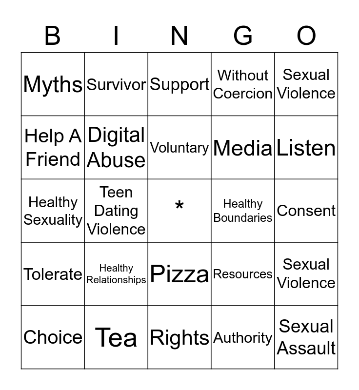 This bingo card has a free space and 24 words: Healthy Relationships, Tea, Voluntary, Choice, Sexual Violence, Myths, Help A Friend, Survivor, Healthy Boundaries, Pizza, Media, Healthy Sexuality, Resources, Sexual Violence, Digital Abuse, Authority, Consent, Support, Listen, Teen Dating Violence, Sexual Assault, Tolerate, Without Coercion and Rights.