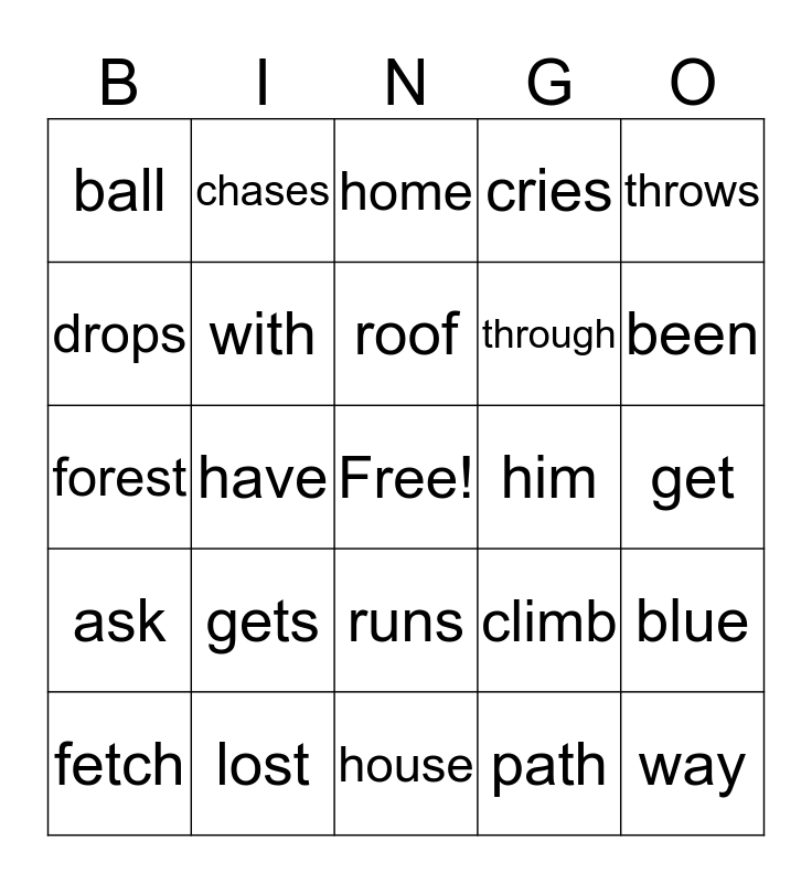 This bingo card has a free space and 24 words: gets, lost, roof, fetch, throws, ball, drops, chases, him, runs, through, forest, climb, blue, with, path, get, home, been, have, way, ask, cries and house.