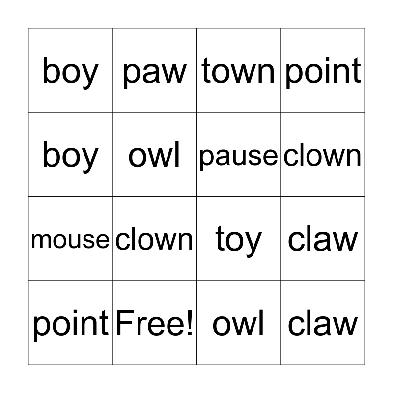 This bingo card has 31 words: caught, oil, claw, house, boy, town, pause, paw, Free!, mouse, owl, point, toy, draw, clown, out, caught, oil, claw, house, boy, town, pause, paw, mouse, owl, point, toy, draw, clown and out.