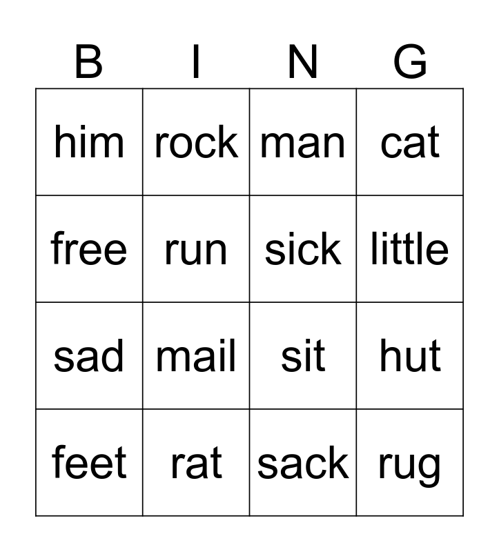 This bingo card has 16 words: rat, hut, man, him, sad, rock, sit, sack, free, run, feet, cat, mail, little, sick and rug.