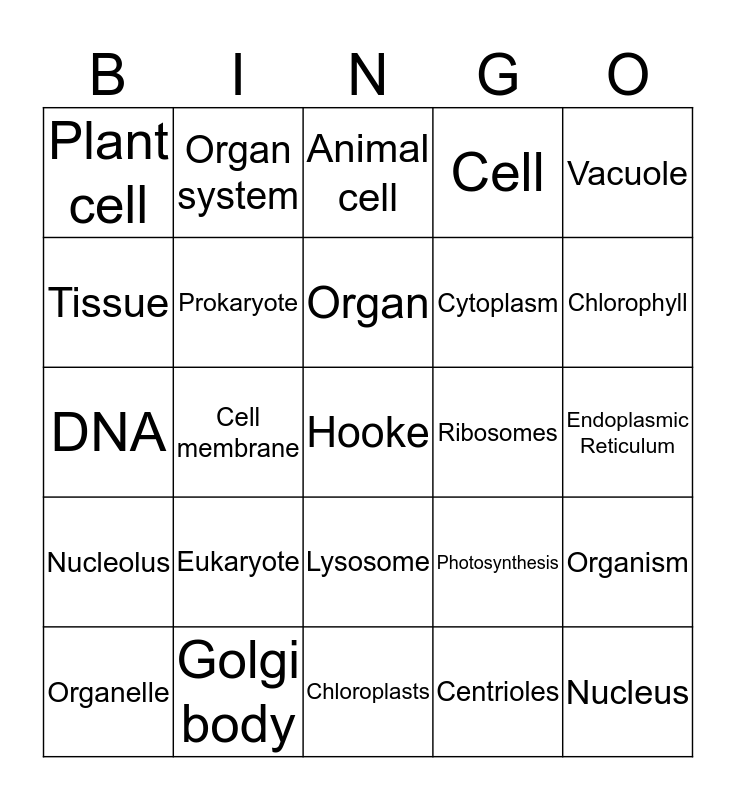 This bingo card has a free space and 29 words: Organelle, Cell wall, Cell membrane, Mitochondria, Plant cell, Animal cell, Prokaryote, Eukaryote, Ribosomes, Golgi body, Endoplasmic Reticulum, Nucleus, Chloroplasts, Centrioles, Chlorophyll, Bacteria, Lysosome, Nucleolus, Vacuole, DNA, Photosynthesis, ATP, Cytoplasm, Tissue, Cell, Organ system, Organism, Organ and Schwann.