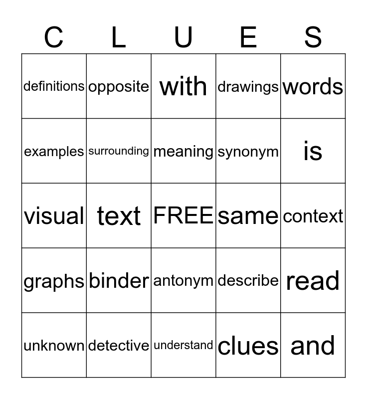 This bingo card has a free space and 24 words: binder, detective, meaning, unknown, words, definitions, examples, opposite, same, antonym, synonym, visual, describe, read, surrounding, clues, context, with, is, text, and, graphs, drawings and understand.