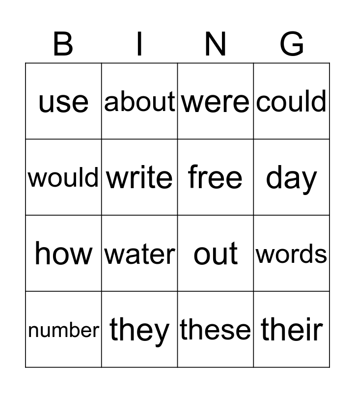 This bingo card has 16 words: they, words, were, use, how, about, out, these, would, write, number, could, water, day, free and their.
