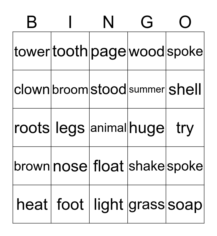 This bingo card has a free space and 24 words: nose, foot, stood, heat, spoke, tower, clown, tooth, huge, float, summer, roots, shake, spoke, broom, grass, try, page, shell, legs, soap, brown, wood and light.
