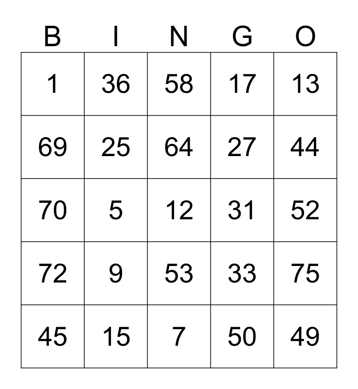 This bingo card has a free space and 24 words: 9, 15, 64, 45, 13, 1, 69, 36, 31, 53, 27, 70, 33, 75, 25, 50, 52, 58, 44, 5, 49, 72, 17 and 7.