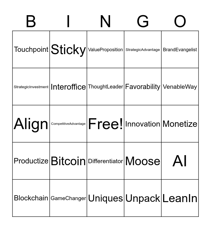 This bingo card has a free space and 37 words: Verticals, Lanes, Interdisciplinary, Interoffice, AI, Bitcoin, ThoughtLeader, Aggregator, BrandEvangelist, ChangeAgent, CompetitiveAdvantage, StrategicAdvantage, LeanIn, Monetize, StrategicInvestment, Productize, Stakeholder, ValueProposition, Differentiator, Innovation, Touchpoint, VenableWay, Blockchain, Uniques, Transparent, Unpack, Sticky, Rightsize, Organic, Socialize, Holistic, GameChanger, Align, Value, Moose, Favorability and Drivers.