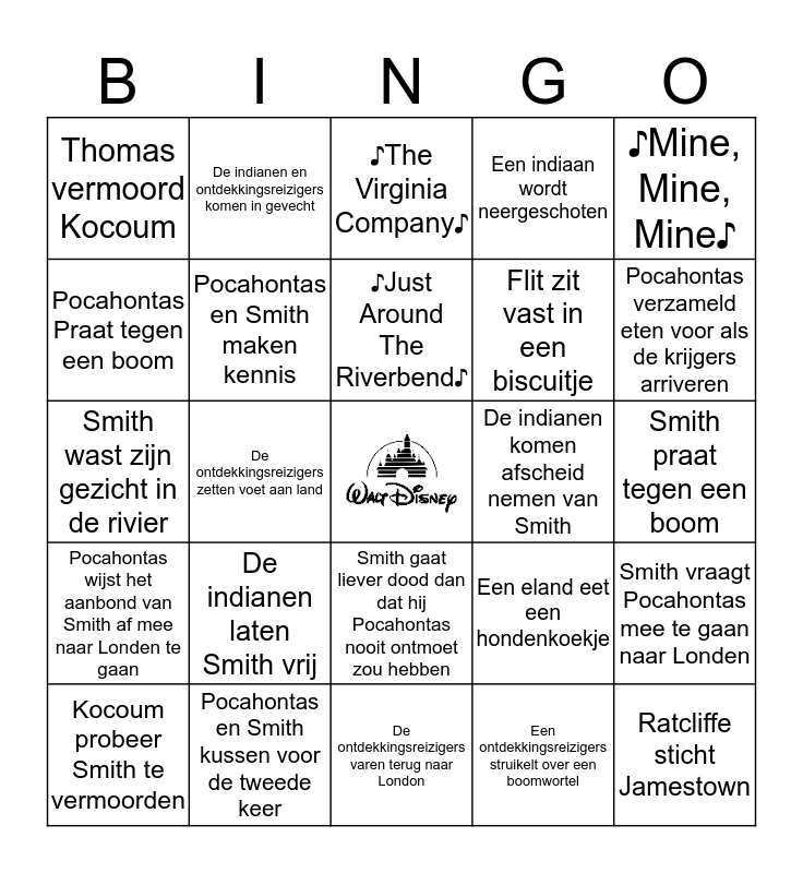 This bingo card has a free space and 75 words: Disneylogo in beeld, ♪Tromgeroffel♪, ♪The Virginia Company♪, De ontdekkingsreizigers varen uit, Man over boord, Ratcliffe belooft de ontdekkingsreizigers vrijheid en welvaart, De ontdekkingsreizigers drinken wijn, De indianen varen in kano’s, Een indiaan blaast op een schelp, De indianen rijgen vissen aan hun speren, De indianenkinderen spelen een potje lacrosse, Pocahontas springt van een klif, ♪Just Around The Riverbend♪, Pocahontas Praat tegen een boom, Pocahontas luistert naar de wind, De ontdekkingsreizigers zetten voet aan land, Meeko krijgt een biscuitje van Smith, Ratcliffe sticht Jamestown, Meeko en Percy zitten samen in bad, ♪Mine, Mine, Mine♪, De ontdekkingsreizigers gaan opzoek naar goud, Smith wast zijn gezicht in de rivier, Pocahontas en Smith maken kennis, De indianen en ontdekkingsreizigers komen in gevecht, Een indiaan wordt neergeschoten, Pocahontas zet een helm op, Meeko en Pocahontas schudden handen, Meeko steelt het kompas, Pocahontas en Smith maken ruzie, Smith valt uit een boom, ♪Coulors of the wind♪, De ontdekkingsreizigers ronden hun fort af, Meeko steelt Percy zijn koekjes, Een eland eet een hondenkoekje, Pocahontas verzameld eten voor als de krijgers arriveren, Flit zit vast in een biscuitje, Smith laat Pocahontas zien wat goud is, Pocahontas verteld Smith dat er geen goud te vinden is, Smith praat tegen een boom, Een ontdekkingsreizigers struikelt over een boomwortel, Percy zit vast in een boomstronk, Smith glipt er stiekem tussenuit, Meeko gebruikt Flit als zwaard, De boom verteld over het rimpel-effect, Smith en Pocahontas kussen, Kocoum betrapt Smith en Pocahontas, Kocoum probeer Smith te vermoorden, Thomas vermoord Kocoum, Smith wordt opgepakt door de indianen, Smith krijgt de schuld van de moord op Kocoum, Smith zit vastgebonden in een tent, Smith gaat liever dood dan dat hij Pocahontas nooit ontmoet zou hebben, ♪Savages♪, Indianen en ontdekkingsreizigers bereiden zich voor op oorlog, Meeko geeft Pocahontas het kompas, Het kompas wijst Pocahontas de weg, Smith zit vast in een strop, De beul staat klaar om Smith om te brengen, Pocahontas red Smith zijn leven, Pocahontas geeft een vredelievende speech, De indianen laten Smith vrij, De indianen en ontdekkingsreizigers bereiken een wapenstilstand, Ratcliffe schiet Smith neer, De ontdekkingsreizigers pakken Ratcliffe op, Ratcliffe ligt geketend in een roeiboot, De indianen komen afscheid nemen van Smith, Smith houdt zich groot ondanks de pijn, Smith is altijd welkom bij de indianen, Percy en Meeko maken geen ruzie meer, Smith vraagt Pocahontas mee te gaan naar Londen, Pocahontas wijst het aanbond van Smith af mee naar Londen te gaan, Pocahontas en Smith kussen voor de tweede keer, Smith wordt per brancard in de boot gezet, De ontdekkingsreizigers varen terug naar London and Pocahontas zwaait Smith uit..