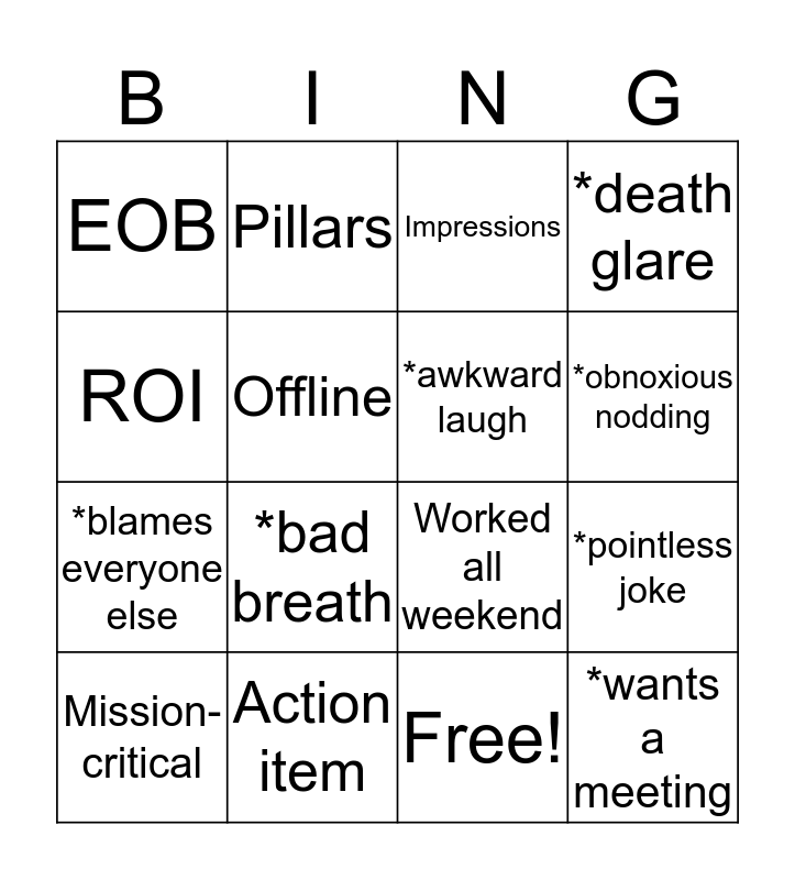 This bingo card has 17 words: Free!, Mission-critical, Impressions, EOB, *bad breath, *death glare, *pointless joke, *awkward laugh, *obnoxious nodding, Offline, Action item, Worked all weekend, ROI, Pillars, *blames everyone else, *taps foot and *wants a meeting.