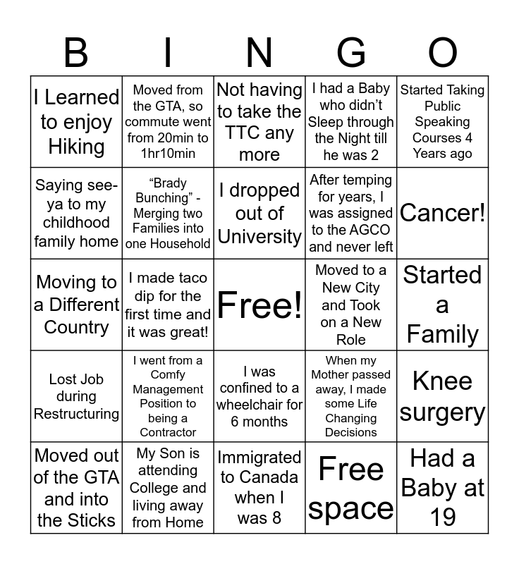 This bingo card has a free space and 25 words: I went from a Comfy Management Position to being a Contractor, Immigrated to Canada when I was 8, I dropped out of University, Moved out of the GTA and into the Sticks, Started Taking Public Speaking Courses 4 Years ago, I Learned to enjoy Hiking, Saying see-ya to my childhood family home, Moved from the GTA, so commute went from 20min to 1hr10min, Moved to a New City and Took on a New Role, I was confined to a wheelchair for 6 months, After temping for years, I was assigned to the AGCO and never left, Moving to a Different Country, When my Mother passed away, I made some Life Changing Decisions, Knee surgery, “Brady Bunching” - Merging two Families into one Household, New Child, Job and House all in < 1 Month, Started a Family, Not having to take the TTC any more, Cancer!, I made taco dip for the first time and it was great!, Had a Baby at 19, My Son is attending College and living away from Home, Lost Job during Restructuring, I had a Baby who didn’t Sleep through the Night till he was 2 and Free space.