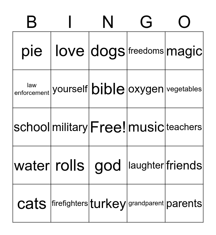 This bingo card has a free space and 24 words: rolls, firefighters, bible, cats, magic, pie, law enforcement, love, music, god, oxygen, school, laughter, friends, yourself, grandparent, teachers, dogs, vegetables, military, parents, water, freedoms and turkey.