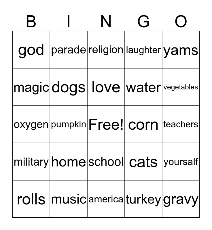 This bingo card has a free space and 24 words: home, music, love, rolls, yams, god, magic, parade, corn, school, water, oxygen, cats, yoursalf, dogs, turkey, teachers, religion, vegetables, pumpkin, gravy, military, laughter and america.