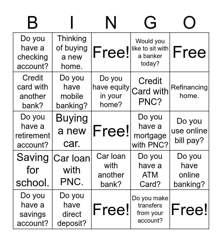 This bingo card has a free space and 24 words: Car loan with PNC., Do you have direct deposit?, Do you have equity in your home?, Do you have a savings account?, Free, Do you have a checking account?, Credit card with another bank?, Thinking of buying a new home., Do you have a mortgage with PNC?, Car loan with another bank?, Credit Card with PNC?, Do you have a retirement account?, Do you have a ATM Card?, Do you have online banking?, Do you have mobile banking?, Do you make transfers from your account?, Do you use online bill pay?, Free!, Refinancing home., Buying a new car., Free!, Saving for school., Would you like to sit with a banker today? and Free!.