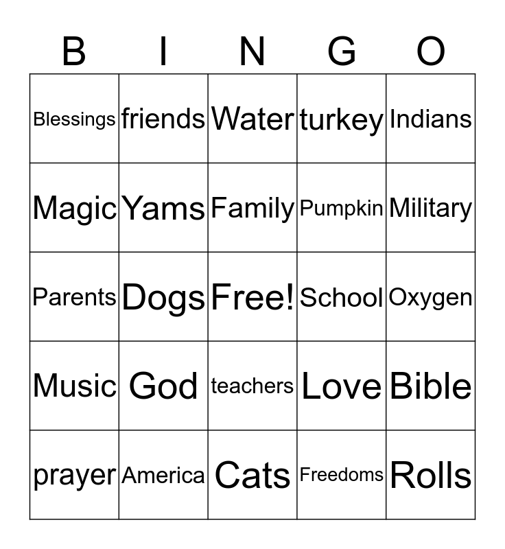 This bingo card has a free space and 24 words: God, America, Family, prayer, Indians, Blessings, Magic, friends, School, teachers, Pumpkin, Parents, Love, Bible, Yams, Freedoms, Oxygen, Water, Military, Dogs, Rolls, Music, turkey and Cats.