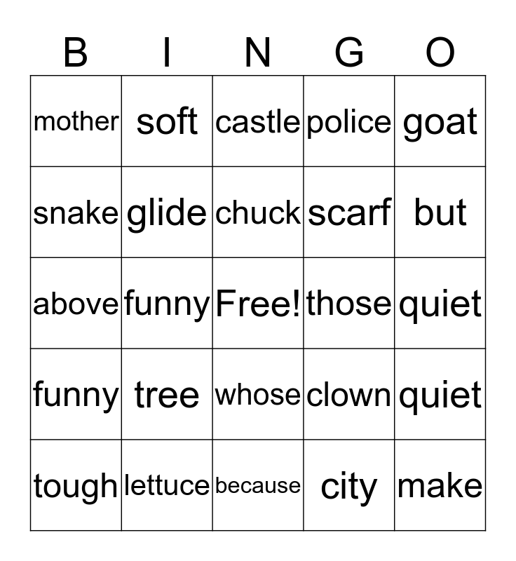This bingo card has a free space and 45 words: through, make, rough, tough, high, city, castle, corn, goat, lettuce, police, those, whose, tree, three, because, chase, above, gone, but, soft, spoke, coat, mother, father, quiet, quick, frown, clown, funny, stop, quiet, quick, frown, clown, funny, stop, quiet, quick, chuck, snake, scarf, clown, glide and plane.