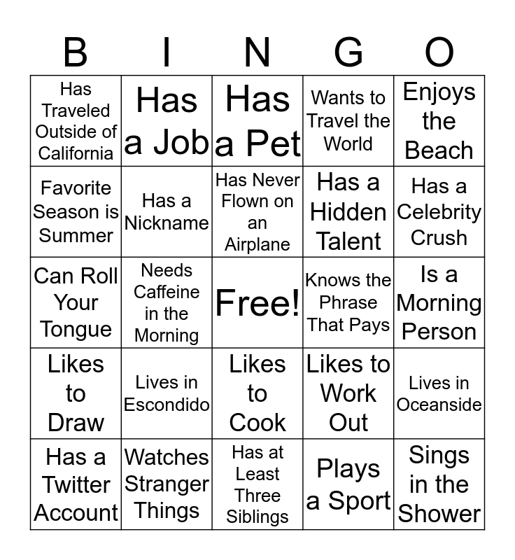 This bingo card has a free space and 24 words: Lives in Escondido, Watches Stranger Things, Has Never Flown on an Airplane, Has a Twitter Account, Enjoys the Beach, Has Traveled Outside of California, Favorite Season is Summer, Has a Job, Knows the Phrase That Pays, Likes to Cook, Has a Hidden Talent, Can Roll Your Tongue, Likes to Work Out, Lives in Oceanside, Has a Nickname, Plays a Sport, Is a Morning Person, Has a Pet, Has a Celebrity Crush, Needs Caffeine in the Morning, Sings in the Shower, Likes to Draw, Wants to Travel the World and Has at Least Three Siblings.