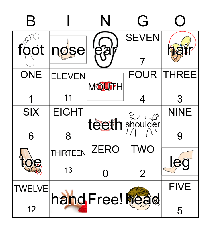 This bingo card has 11 images and 25 words: toe, hand, teeth, head, hair, foot, nose, ear, shoulder, leg, ONE 1, ELEVEN 11, Free!, TWO 2, THREE 3, TWELVE 12, EIGHT 8, MOUTH, FOUR 4, NINE 9, SIX 6, THIRTEEN 13, ZERO 0, SEVEN 7 and FIVE 5.