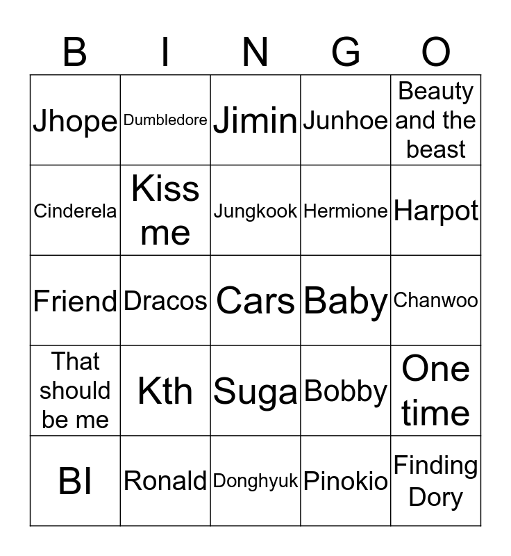 This bingo card has a free space and 24 words: Kth, Ronald, Jungkook, BI, Beauty and the beast, Jhope, Cinderela, Dumbledore, Baby, Suga, Hermione, Friend, Bobby, One time, Kiss me, Pinokio, Chanwoo, Jimin, Harpot, Dracos, Finding Dory, That should be me, Junhoe and Donghyuk.