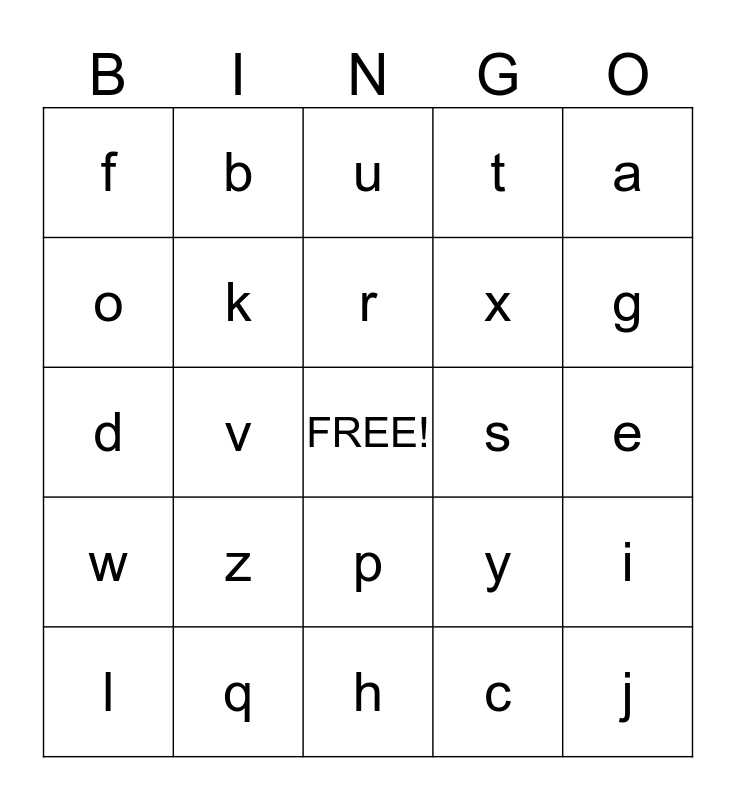 This bingo card has a free space and 24 words: z, q, r, l, a, f, o, b, s, p, x, d, y, i, k, c, e, u, g, v, j, w, t and h.