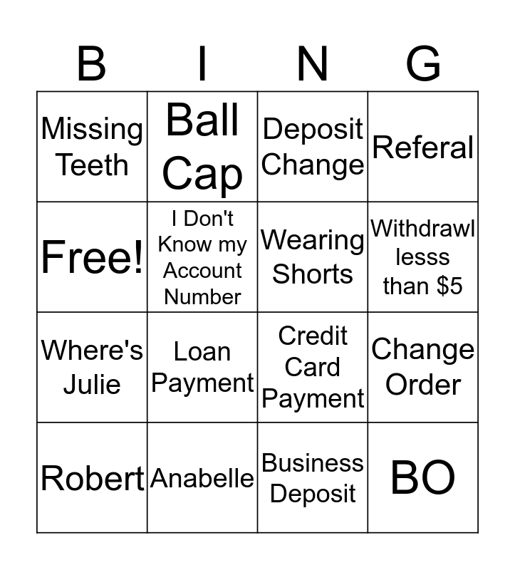 This bingo card has 16 words: Anabelle, Change Order, Deposit Change, Missing Teeth, Where's Julie, Ball Cap, Credit Card Payment, Business Deposit, Free!, I Don't Know my Account Number, Robert, Referal, Loan Payment, Withdrawl lesss than $5, Wearing Shorts and BO.