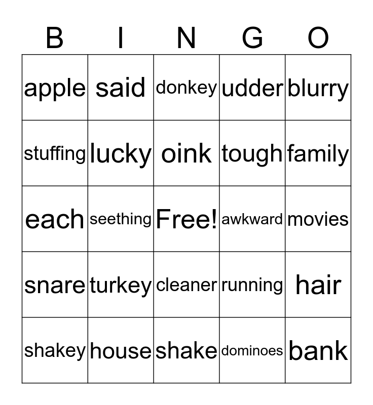 This bingo card has a free space and 24 words: turkey, house, oink, shakey, blurry, apple, stuffing, said, awkward, cleaner, tough, each, running, hair, lucky, dominoes, movies, donkey, family, seething, bank, snare, udder and shake.