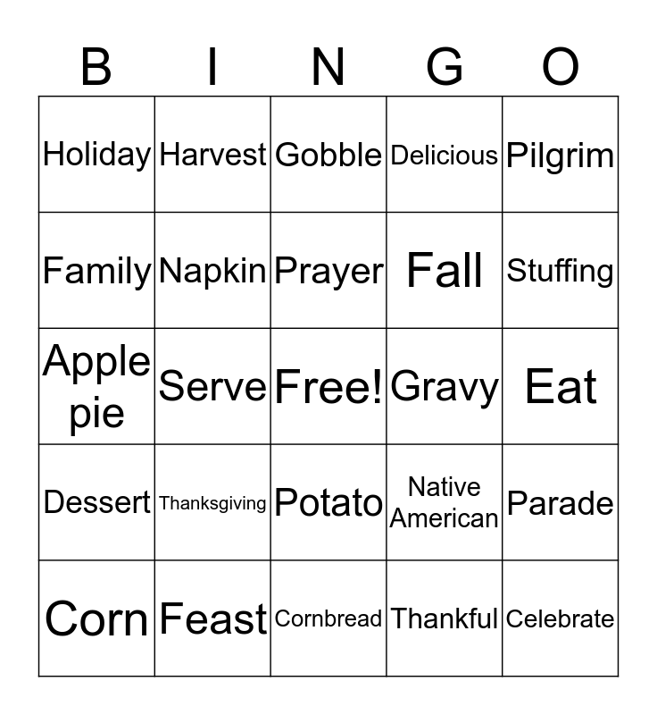 This bingo card has a free space and 24 words: Thanksgiving, Feast, Prayer, Corn, Pilgrim, Holiday, Family, Harvest, Gravy, Potato, Fall, Apple pie, Native American, Parade, Napkin, Thankful, Eat, Gobble, Stuffing, Serve, Celebrate, Dessert, Delicious and Cornbread.