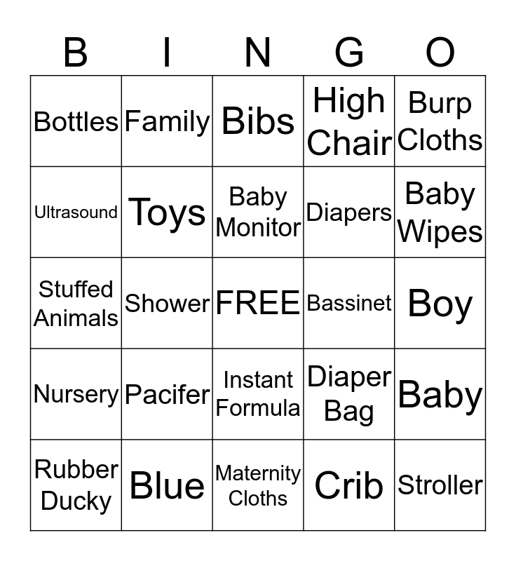 This bingo card has a free space and 24 words: Pacifer, Blue, Baby Monitor, Rubber Ducky, Burp Cloths, Bottles, Ultrasound, Family, Bassinet, Instant Formula, Diapers, Stuffed Animals, Diaper Bag, Baby, Toys, Crib, Boy, Bibs, Baby Wipes, Shower, Stroller, Nursery, High Chair and Maternity Cloths.