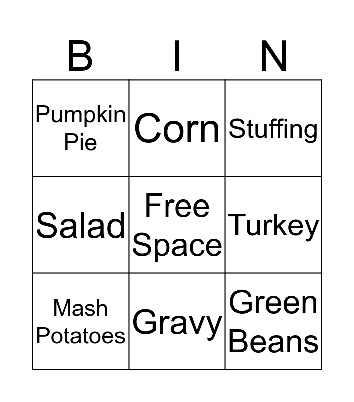 This bingo card has a free space and 8 words: Turkey, Stuffing, Corn, Mash Potatoes, Pumpkin Pie, Green Beans, Salad and Gravy.