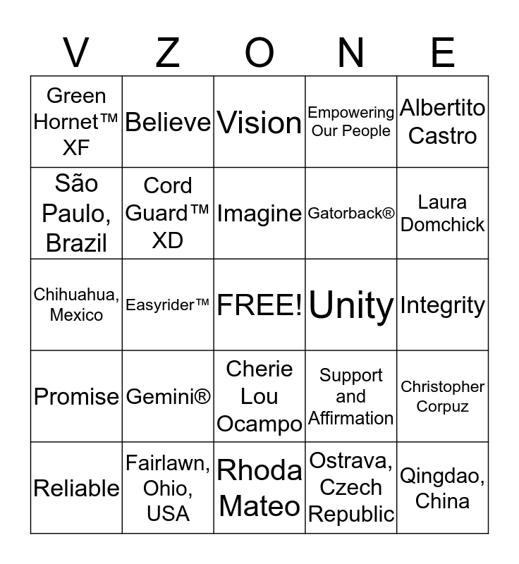 This bingo card has a free space and 24 words: Gemini®, Fairlawn, Ohio, USA, Imagine, Reliable, Albertito Castro, Green Hornet™ XF, São Paulo, Brazil, Believe, Unity, Cherie Lou Ocampo, Gatorback®, Chihuahua, Mexico, Support and Affirmation, Christopher Corpuz, Cord Guard™ XD, Ostrava, Czech Republic, Integrity, Vision, Laura Domchick, Easyrider™, Qingdao, China, Promise, Empowering Our People and Rhoda Mateo.