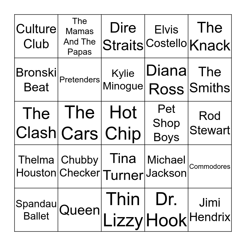 This bingo card has 52 words: Smashing Pumpkins, Hot Chip, Talking Heads, Thin Lizzy, Chubby Checker, The Beatles, The Mamas And The Papas, ABBA, Bronski Beat, Phil Collins, Pretenders, Duran Duran, Commodores, Michael Jackson, Belinda Carlisle, Katrina and the Waves, Kylie Minogue, Pet Shop Boys, Dusty Springfield, The Knack, The Cars, Dr. Hook, Culture Club, Diana Ross, UB40, Jimi Hendrix, David Bowie & Mick Jagger, Kim Wilde, The Smiths, Roxy Music, Neneh Cherry, Elvis Costello, Joan Jett, Supergrass, Madness, Dire Straits, Queen, The Kinks, Supertramp, Tears For Fears, Elton John, Rod Stewart, Thelma Houston, Toto, Tina Turner, Primal Scream, Led Zeppelin, The Clash, Pink Floyd, Fleetwood Mac, Spandau Ballet and Cyndi Lauper.