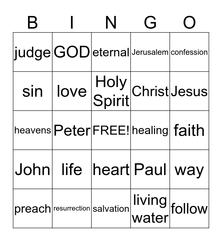 This bingo card has a free space and 24 words: life, resurrection, Holy Spirit, preach, confession, judge, sin, GOD, healing, heart, Christ, heavens, Paul, way, love, living water, faith, eternal, Jesus, Peter, follow, John, Jerusalem and salvation.
