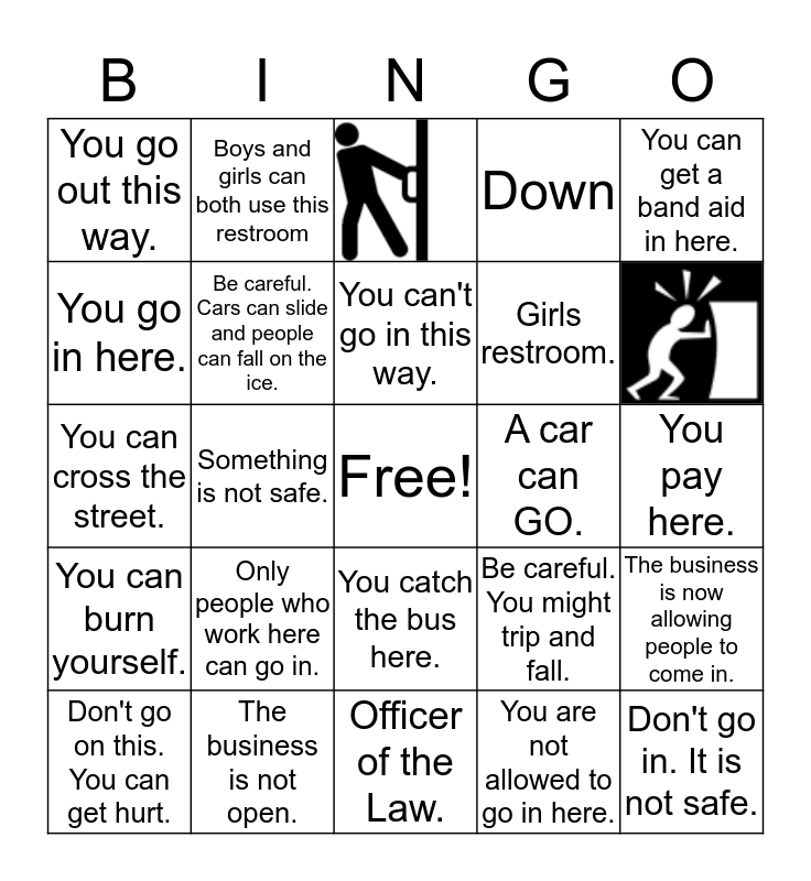 This bingo card has 2 images, a free space and 22 words: Only people who work here can go in., The business is not open., You can't go in this way., Don't go on this. You can get hurt., You can get a band aid in here., You go out this way., You go in here., Boys and girls can both use this restroom, A car can GO., You catch the bus here., Girls restroom., You can cross the street., Be careful. You might trip and fall., The business is now allowing people to come in., Be careful. Cars can slide and people can fall on the ice., You are not allowed to go in here., You pay here., Something is not safe., Don't go in. It is not safe., You can burn yourself., Down and Officer of the Law..
