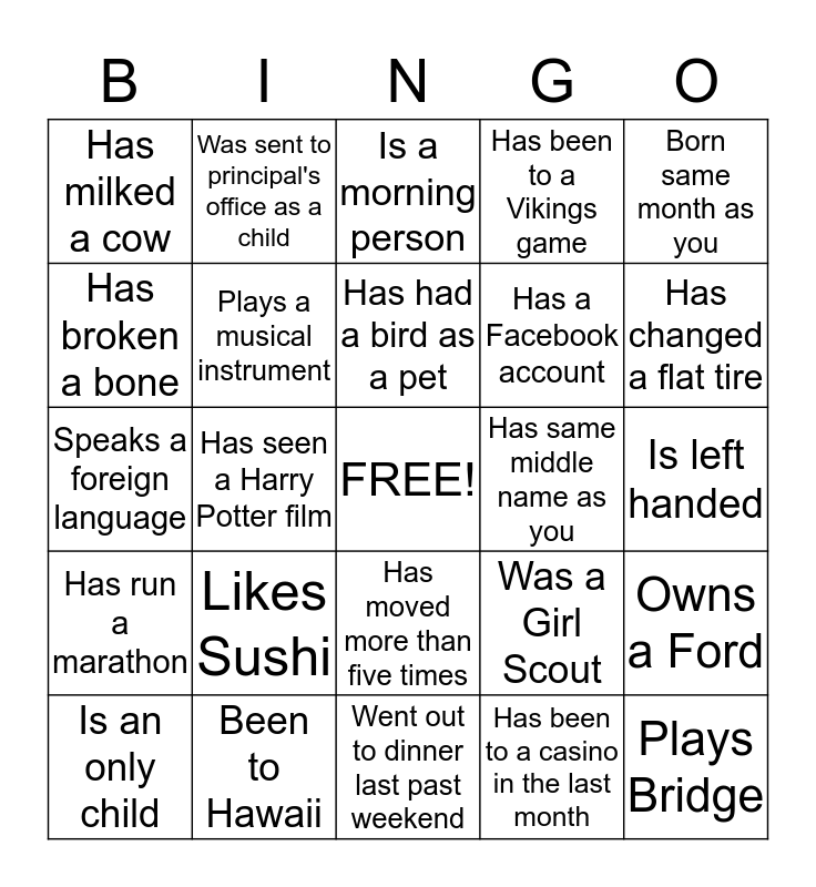This bingo card has a free space and 24 words: Likes Sushi, Been to Hawaii, Has had a bird as a pet, Is an only child, Born same month as you, Has milked a cow, Has broken a bone, Was sent to principal's office as a child, Has same middle name as you, Has moved more than five times, Has a Facebook account, Speaks a foreign language, Was a Girl Scout, Owns a Ford, Plays a musical instrument, Has been to a casino in the last month, Is left handed, Is a morning person, Has changed a flat tire, Has seen a Harry Potter film, Plays Bridge, Has run a marathon, Has been to a Vikings game and Went out to dinner last past weekend.