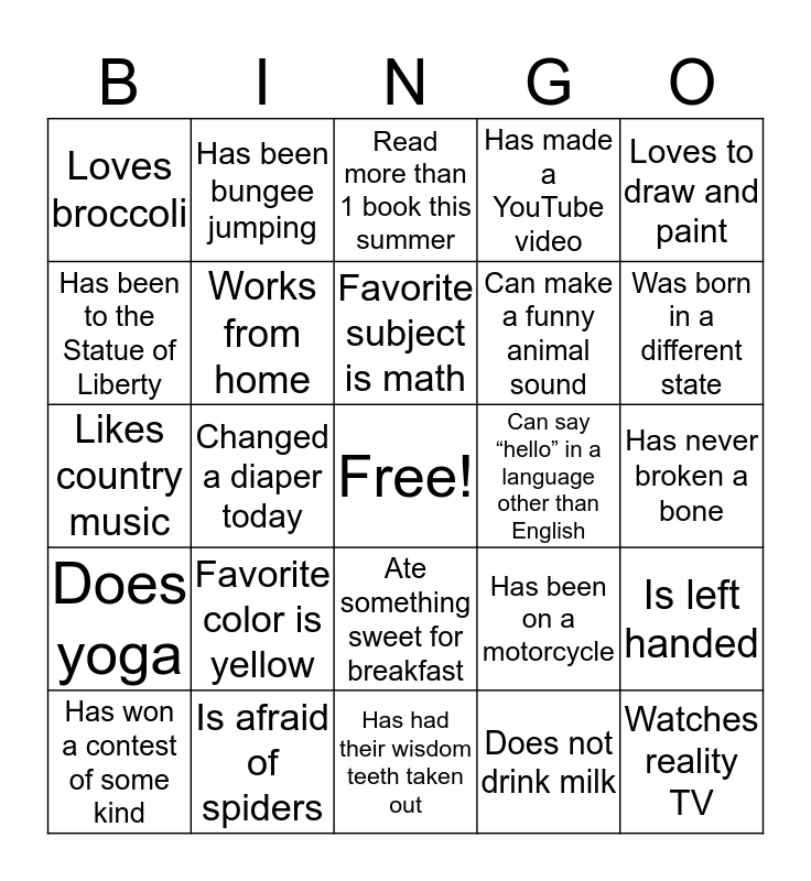 This bingo card has a free space and 24 words: Favorite color is yellow, Is afraid of spiders, Favorite subject is math, Has won a contest of some kind, Loves to draw and paint, Loves broccoli, Has been to the Statue of Liberty, Has been bungee jumping, Can say “hello” in a language other than English, Ate something sweet for breakfast, Can make a funny animal sound, Likes country music, Has been on a motorcycle, Is left handed, Works from home, Does not drink milk, Has never broken a bone, Read more than 1 book this summer, Was born in a different state, Changed a diaper today, Watches reality TV, Does yoga, Has made a YouTube video and Has had their wisdom teeth taken out.