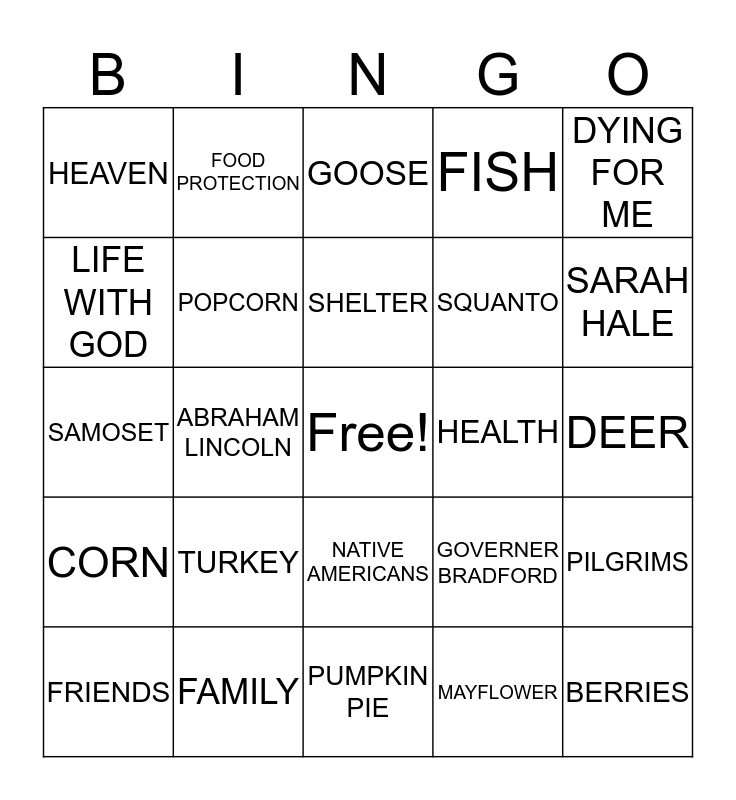 This bingo card has a free space and 24 words: TURKEY, FAMILY, SHELTER, FRIENDS, DYING FOR ME, HEAVEN, LIFE WITH GOD, FOOD PROTECTION, HEALTH, NATIVE AMERICANS, SQUANTO, SAMOSET, GOVERNER BRADFORD, PILGRIMS, POPCORN, MAYFLOWER, DEER, GOOSE, SARAH HALE, ABRAHAM LINCOLN, BERRIES, CORN, FISH and PUMPKIN PIE.